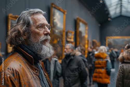 A man with grey hair stands observing classical paintings in a crowded art gallery, conveying a sense of culture and appreciation for the arts