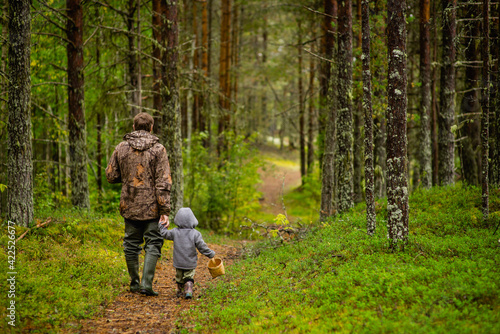 a man with his son in walking in the woods, selective focus