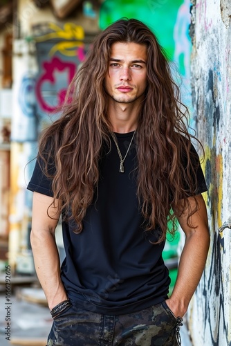 man, long, hair, standing, front, graffiti, covered, wall, black, shirt, camouflage, pant, urban, street, art, outdoors, casual attire, fashion, hipster, youthful, modern, trendy, alley, blanket, brown, doodle, jean, lean, pose, t, portrait, young, straight, hand, pocket, serious, expression, face, looking, camera, late, 20s, early, 30s, t-shirt, gold, necklace, background