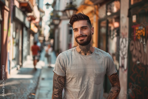 person, portrait, man, adult, happy, city, male, street, cheerful, young, smile, outdoors, caucasian, photogenic, beard, looking, fashionable, happiness, attractive, guy, photogenic, lifestyle, white, modern, cool, positive, face, urban, model, day, copy space, background, confidence, summer, 30s, closeup, casual attire, t-shirt, one person, carefree, beautiful, style, trendy, stylish, business, standing, photo