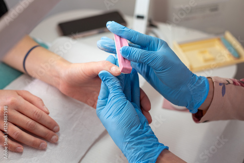 A manicurist performing a Japanese manicure on a client