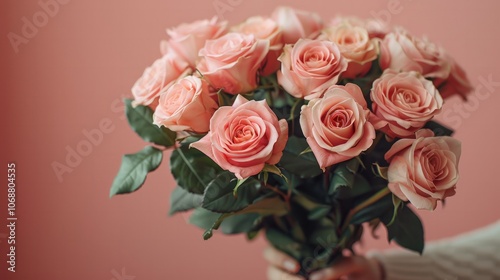 A man's hand grips a bouquet of pink roses in the lower right corner, symbolizing love and power, set against a soft pastel pink background. The hand is positioned on the right side of the image.