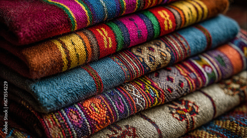 A market stall overflows with a vibrant array of handmade Guatemalan textiles, showcasing a kaleidoscope of traditional patterns and colors