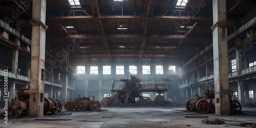 A massive, abandoned factory with rusted machinery and crumbling walls , the space appears to be abandoned or unused , with a sense of emptiness and decay