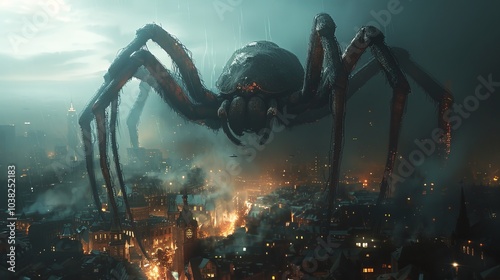 giant, spider, city, fire, storm, night, destruction, chaos, creature, surreal, fantasy, horror, skyline, rain, tension, disaster, urban, eerie, smoke, damage, fear, dramatic, gigantic, arachnid, shadow, apocalypse, invasion, surrealism, mythology, scene, ominous, thunder, lightning, building, devastation, terror, environment, nocturnal, creature, visual, art