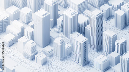 A masterfully crafted isometric 3D-rendered city block, composed of elegant skyscrapers and contemporary buildings, all in a soft, white-gray hue
