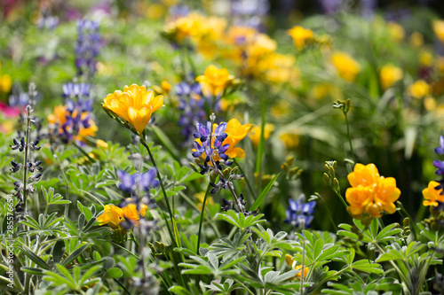 A meadow of blue lupins and yellow fresia flowers