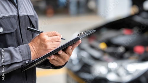 car repair, uniform, engineer, mechanic, car, clipboard, engine, writing, front