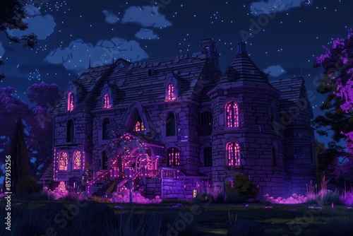 A medieval castle illuminated by vibrant purple lighting, perfect for use in nighttime scenes or fantasy settings