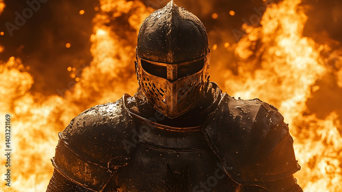 A medieval warrior in full plate armor amidst a fiery backdrop.