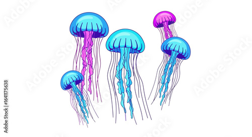 jellyfish, ocean, underwater, marin, life, sea, aquatic, vibrant, colourful, swimming, tentacle, graceful, aethereal, floating, semitransparent, deep, exotic, creature, bioluminescence, beauty, nature, wildlife, illustration, drawing, vignetting, cartoon, vector, isolated, white, background, design, art, graphic, aglow, surreal, dreamlike, fantasy, oceanic, fauna, magenta, indigo