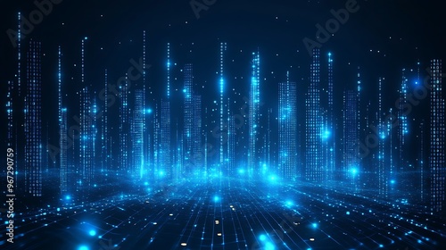 A mesmerizing digital landscape showcasing blue light beams and particles in a futuristic, glowing city atmosphere.