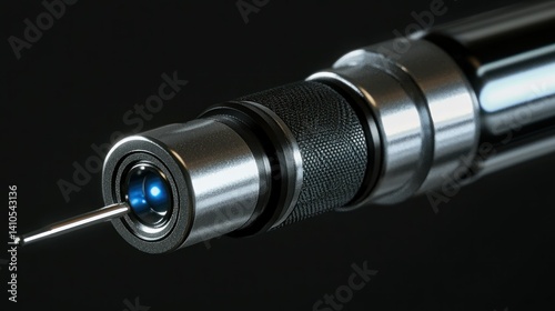 metal, steel, black, dark, light, blue, glow, surface, texture, shiny, tool, device, instrument, laser, needle, point, precision, sharpened, close, macro, detail, chrome, bright, modern, polished, sleek, cylinder, design, technology, futuristic, industrial, smooth, round, ring, grip, knurled, pattern, handle, lens, optic, energy, beam, aperture, isolated, background, abstract