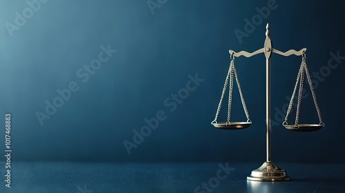 A metallic scale symbolizing justice stands against a dark blue background, reflecting themes of law, balance, and equity.