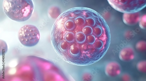 A microscopic view of multiple cells with a focus on a large cell with smaller, pink, round cells inside, against a hazy, light blue background.