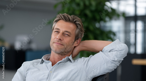 A mid-adult businessman taking a break in a modern office, workplace relaxation, office break, business professional, modern office, work-life balance