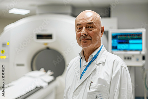 A middle-aged doctor in a white coat stands in front of an MRI machine in a modern medical facility looking confident