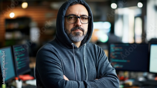 A middle-aged European software developer in a hoodie standing confidently in an office environment, surrounded by computing devices, embodying focus and professionalism in the tech industry.