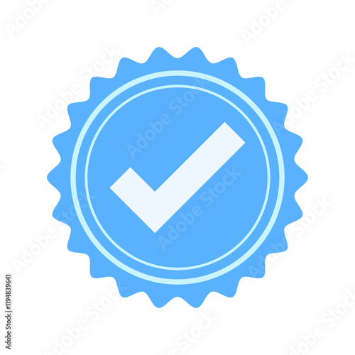 A minimalist blue badge icon vector with a white checkmark at the center, symbolizing verification and approval. Clean design, perfect for branding or digital use