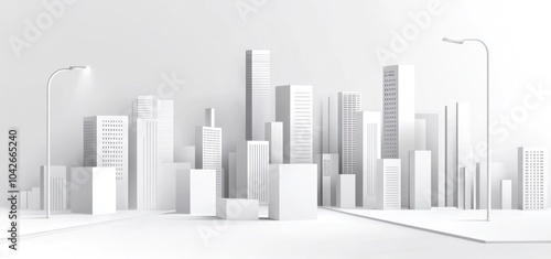 A minimalist cityscape featuring white buildings and street lamps on a light background.