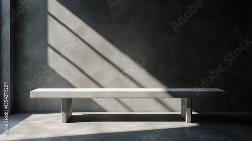 A minimalist concrete bench sitting in a dark room with a stream of sunlight breaking through, casting soft shadows.