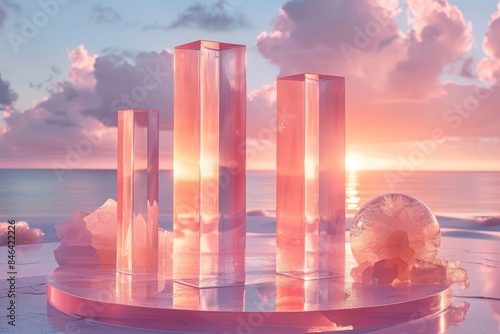 A minimalist glass display set against the backdrop of a pastel sky, featuring clear geometric shapes