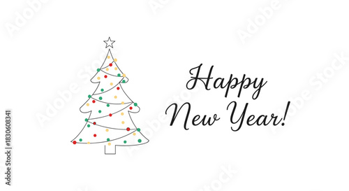 happy new year, christmas tree, vector, illustration, greeting, card, minimalist, simple, design, holiday, celebration, winter, season, isolated, white background, line art, outline, drawing, modern, clean, elegant, decoration, light, colourful, star, festive, new year, christmas, typography, lettering, script, handwritten, art, graphic, beautiful, contemporary, poster, banner