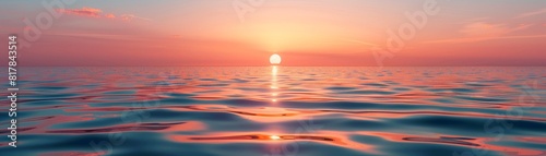 A minimalist, horizontal composition of a calm sea at sunset, reflecting variations of orange and pink in the sky, symbolizing peace and grace, in a realistic style 8K , high-resolution, ultra HD,up32