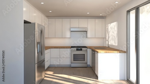 A minimalist kitchen design featuring white cabinets, stainless steel appliances, and a wooden countertop.