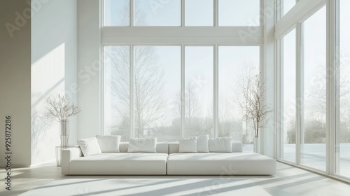 A minimalist living room with a white sofa centered in front of large windows that flood the space with natural light.