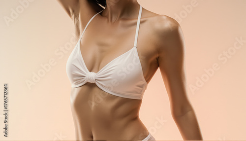 curve, minimalist, studio shot, beauty, fashion, wellness, swimwear, beachwear, elegant, hi-res, photorealistic, premium, sleek, model, torso, studio, summer, confident, luxurious, aesthetic, apparel, femininity, advertising, natural beauty, smooth skin