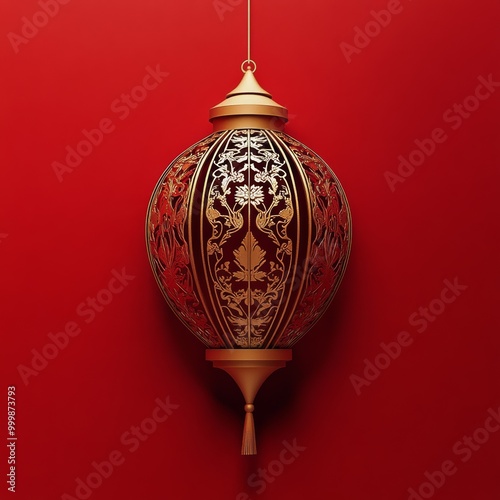 A minimalist, three-dimensional depiction of a lantern, adorned with intricate designs, set against a rich red backdrop for a celebratory effect