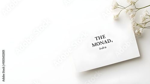 A minimalistic brand design logo for "THE MONAD," featuring the word "Indra" in an elegant, sans-serif font with a soft shadow on a textured white background. The name is carved into the surface of ma