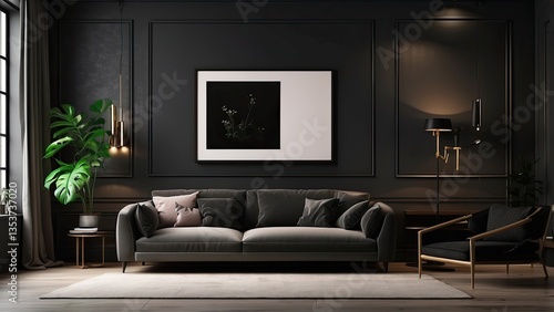 A minimalistic interior features a blank white canvas mounted on a dark gray wall