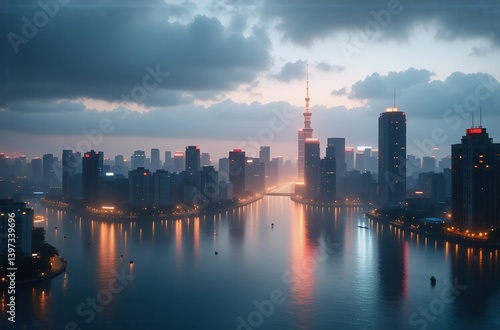 A misty sunrise paints the cityscape with warm hues, reflecting on the tranquil waters. Modern skyscrapers stand tall against the soft morning light.