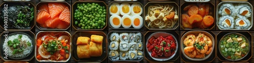 A mix of sushi rolls salmon slices edamame hard boiled eggs and vegetable dishes served in separate trays