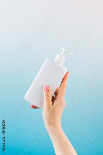 A mockup of a white dispenser with a cosmetic product in a woman's hand on a blue background.