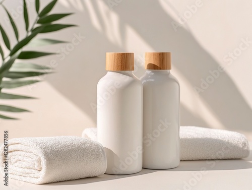 A mockup of two white bottles with wooden caps and one beige towel on a light background, in a minimalist style, high-resolution photography, professional color grading, soft shadows, low contrast,