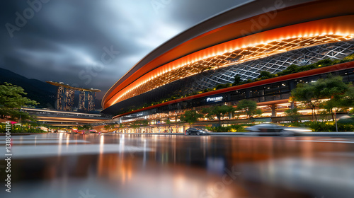 architecture, modern, city, building, night, light, illumination, urban, design, futuristic, structure, construction, exterior, landscape, sky, cloudy, reflecting, water, pavement, street, car, traffic, transportation, tree, plant, green, facades, glasses, metal, curve, pattern, detail, glow, bright, evening, complex, geometric, horizontal, perspective, scale, space, travel, tour tourism, scenery, view, atmosphere, vibrant