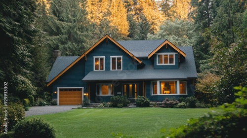 house, home, modern, architecture, exterior, front, yard, lawn, green, tree, forest, nature, landscape, residential, suburban, real estate, property, wood, window, door, siding, roof, chimney, grass, garden, landscaping, foliage, bush, shrub, driveway, pathway, summer, autumn, evening, sunset, light, dusk