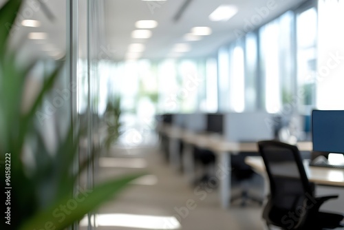 A modern, bright office space with a blurred focus. The scene includes desks,