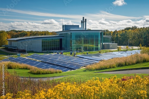 modern, building, many, solar, panel, generating, clean, energy, under, blue, sky, white, cloud, structure, contemporary, facades, glasses, roof, array, photovoltaic, cell, power, electricity, renewable, sustainable, environment, daylight, atmosphere, weather, firmament, horizon, vegetation, grass, field, landscape, hill, tree, foliage, autumn, yellow, wildflower, outdoors, scenery, natural, vista, scene, illumination