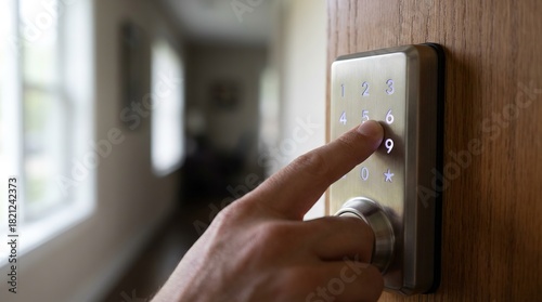 A modern digital keypad lock is being activated with a fingertip, offering a glimpse into the convenience of advanced home security and technological integration.