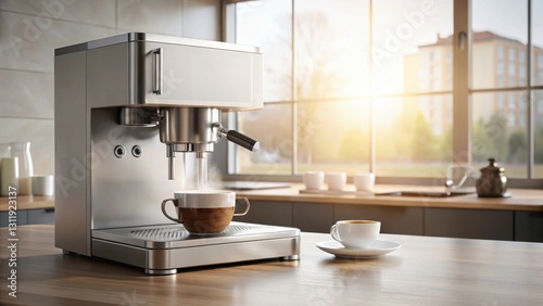 A modern espresso machine brewing a rich cup of coffee on a kitchen counter bathed in sunlight streaming through a large window