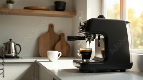 A modern espresso machine brewing rich dark coffee into a glass cup on a kitchen counter in bright sunlight