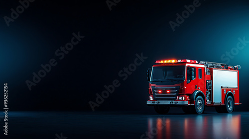A modern fire truck illuminated against a dark background, showcasing its bright lights and sleek design, symbolizing safety and protection.