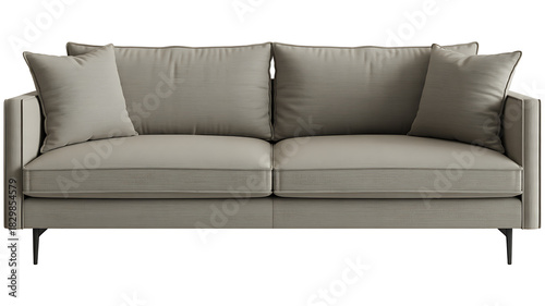 A modern grey fabric sofa with plush cushions and black metal legs, isolated on white background