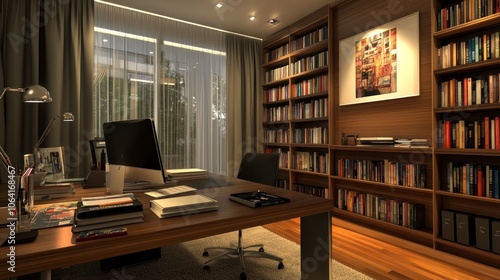 home office, office, desk, computer, bookshelf, book, study, work, workspace, interior, modern, design, furniture, room, lighting, window, curtain, floor, wood, comfortable, organised, decoration, light, desk lamp, chair, office space, work area, reading, relax, stylish, elegant, professional, business, productive, technology, digital, paper, file, document, accessory, office supply