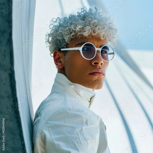 modern, individual, white, hair, confident, futuristic, minimalist, stylish, light, airy, large, window, serene, garment, fashion, contemporary, architecture, portrait, elegance, creativity, indoor, design, atmosphere, unique, beauty, expression, male, trendy, cool, sophisticated, eyewear, goggles, simple, clean, high-coloured, bright, chic, personality, urban, dynamic, fresh, youthful, style, statement, visual, art, illuminated, space