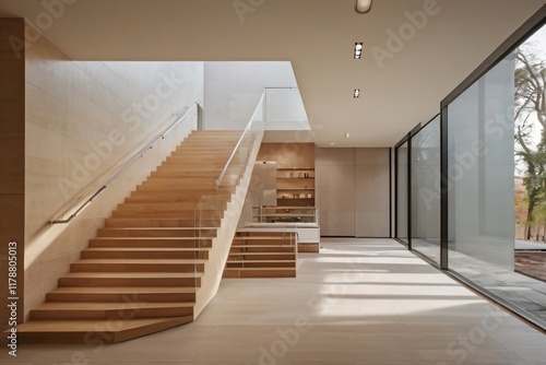 A modern indoor staircase with a sleek and minimalist design. The staircase features light-colored steps, a stainless steel handrail that adds a touch of contemporary elegance.